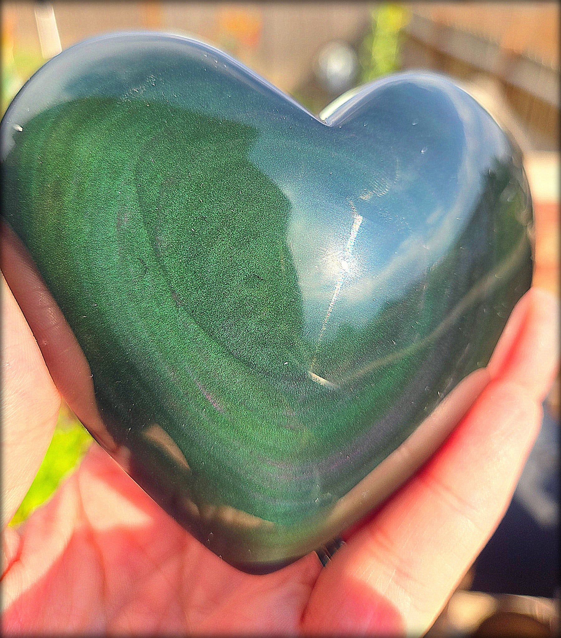 Feel the protective and transformative energy of this Rainbow Obsidian heart carving, measuring approximately 3.4 x 2.7 inches and weighing 9 ounces.