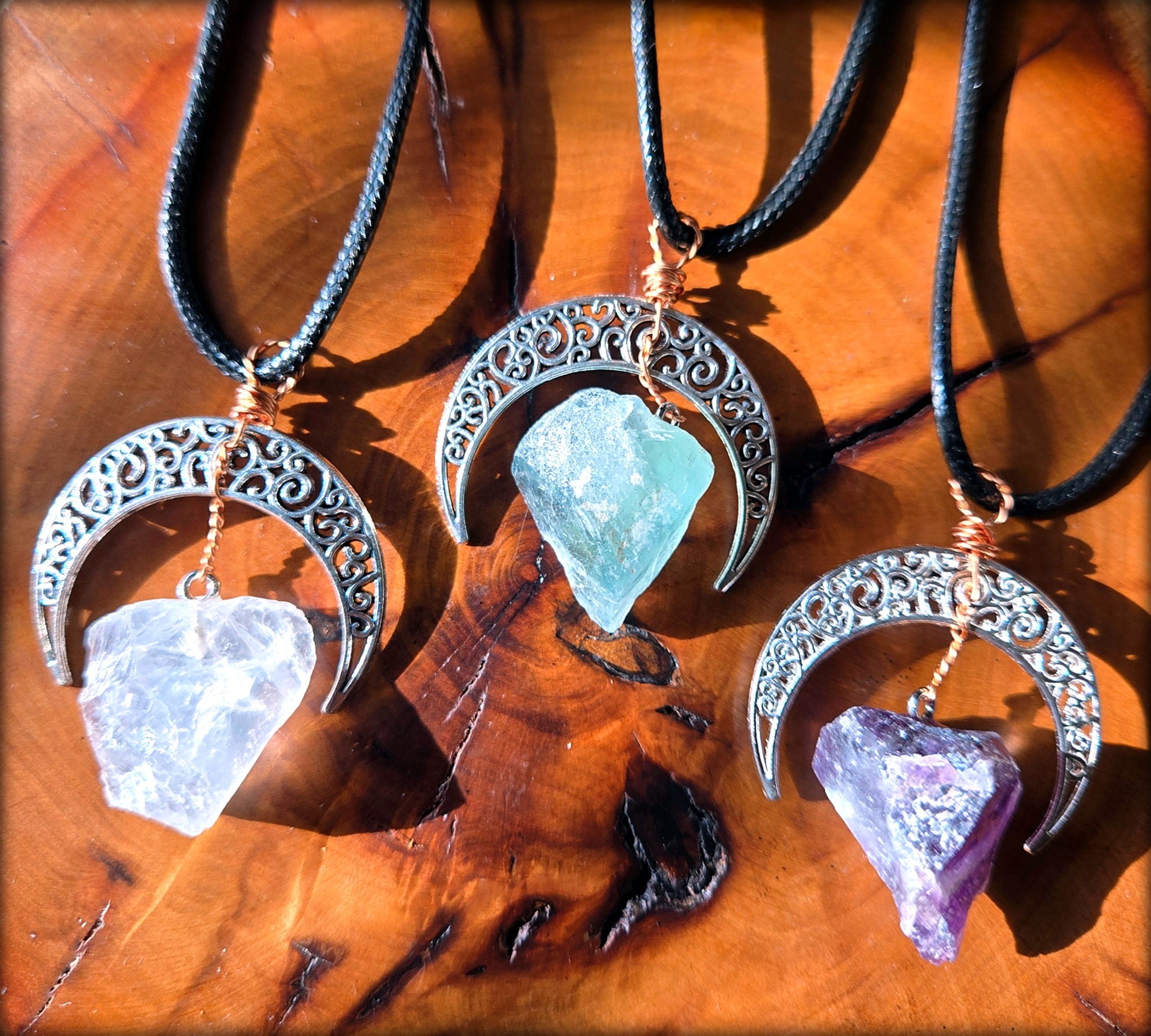 Step into your power with our Crescent Moon Raw Stone Necklace — a blend of celestial energy and grounded Earth magic. Featuring a stainless-steel crescent moon pendant, symbol of transformation, intuition, and new beginnings, each necklace cradles a raw, wire-wrapped crystal of your choice, suspended from an adjustable black rope chain for a comfortable, versatile fit.